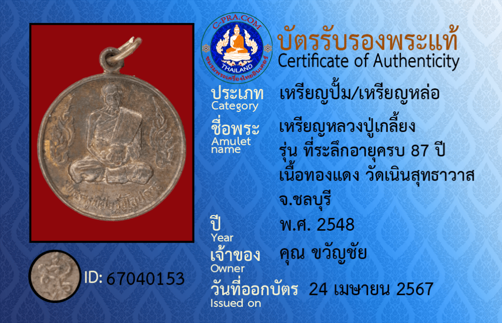 Amulet name :Luang Pu Kliang coin
