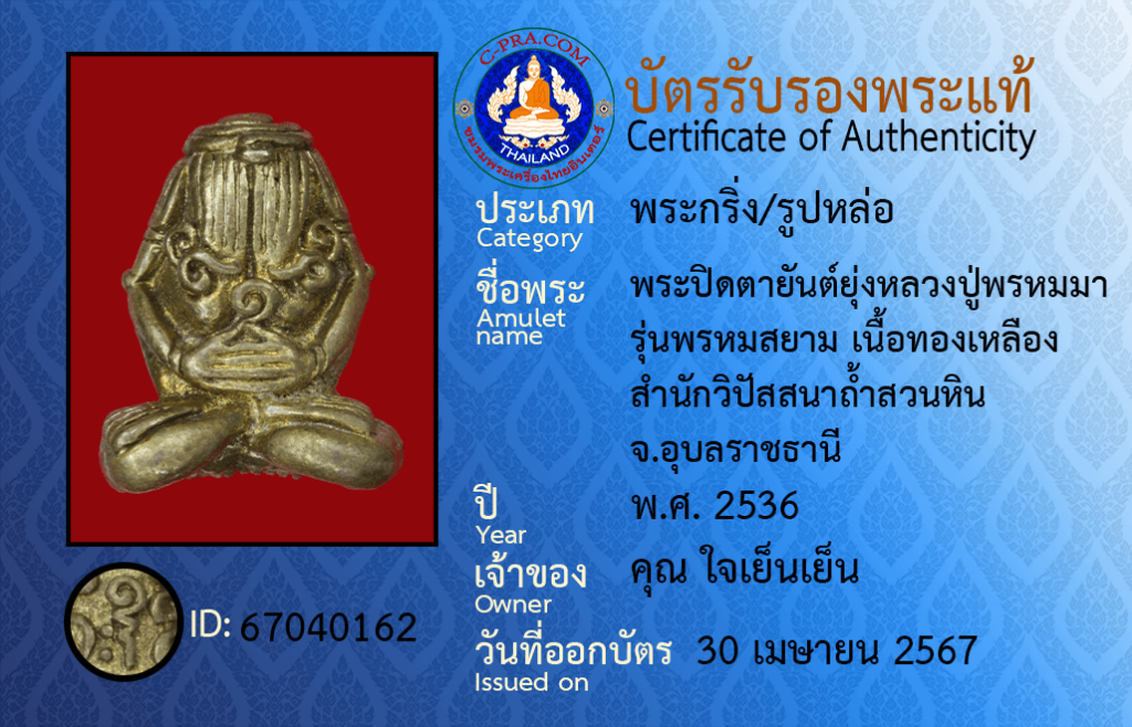 ชื่อพระ :พระปิดตายันต์ยุ่งหลวงปู่พรหมมา รุ่นพรหมสยาม เนื้อทองเหลือง สำนักวิปัสสนาถ้ำสวนหิน จ.อุบลราชธานี