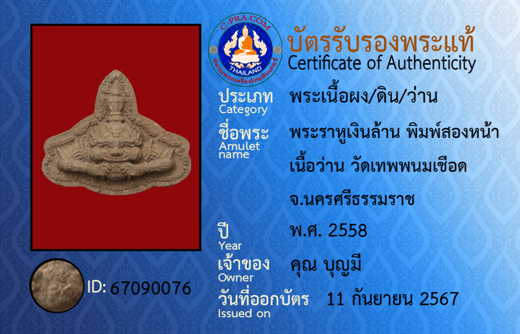 ชื่อพระ : พระราหูเงินล้าน พิมพ์สองหน้า เนื้อว่าน วัดเทพพนมเชือด จ.นครศรีธรรมราช