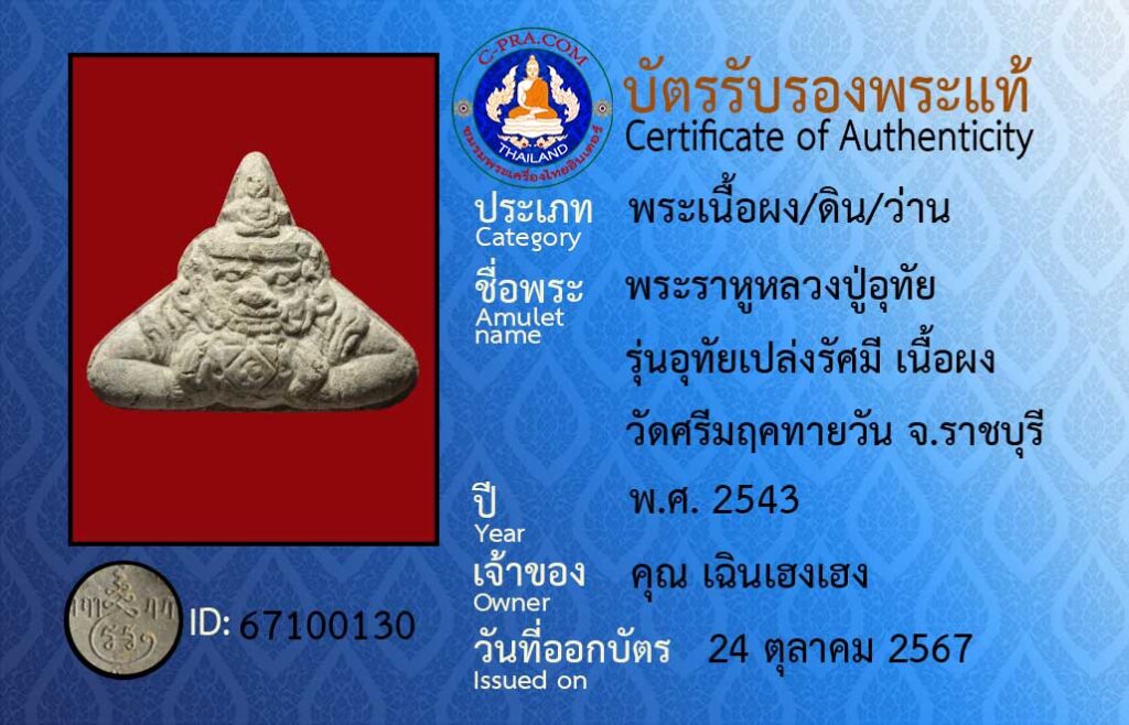 Amulet name : :Phra Rahu Luang Pu Uthai, Uthai radiance model, powder material, Wat Sri Marukhathaiwan, Ratchaburi Province