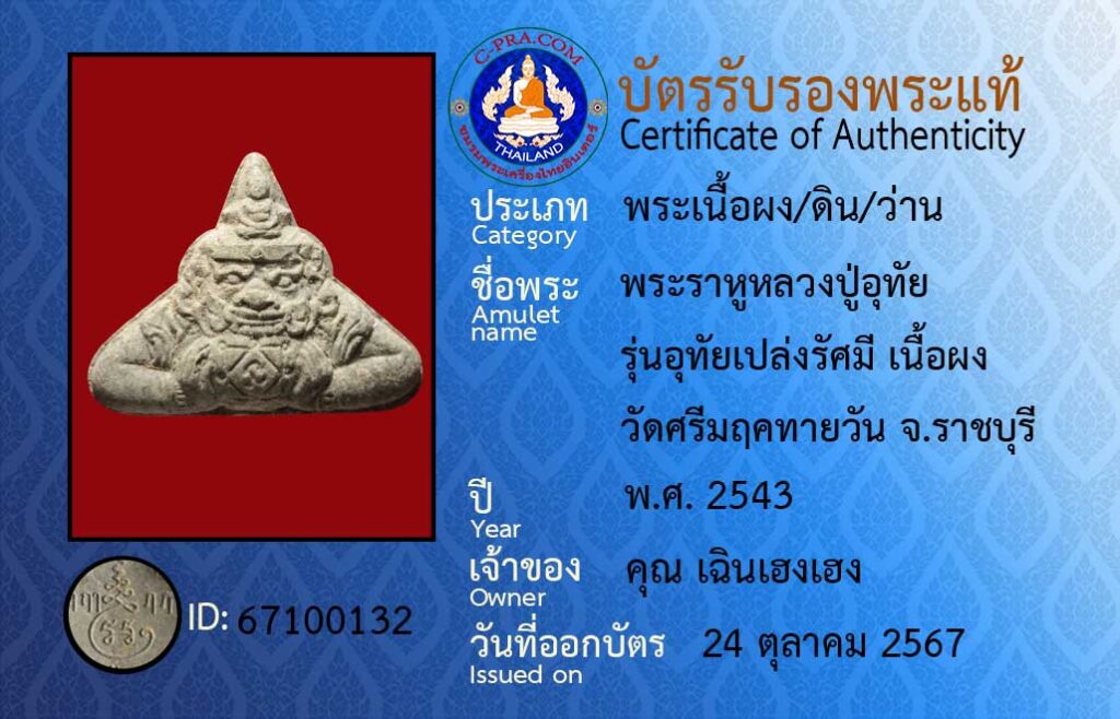 Amulet name : :Phra Rahu Luang Pu Uthai, Uthai radiance model, powder material, Wat Sri Marukhathaiwan, Ratchaburi Province