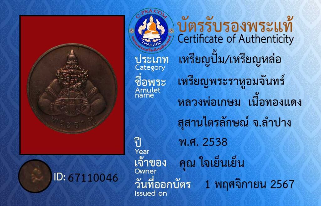 ชื่อพระ :เหรียญพระราหูอมจันทร์ หลวงพ่อเกษม เนื้อทองแดง สุสานไตรลักษณ์ จ.ลำปาง