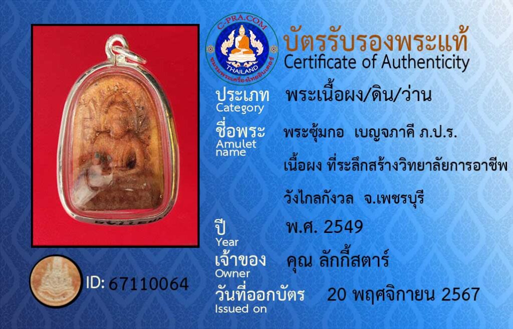 Amulet name :Phra sumkor Benjaphakee B.P.R. Powder material, souvenir for the construction of Wang Klai Kangwon Vocational College, Phetchaburi Province