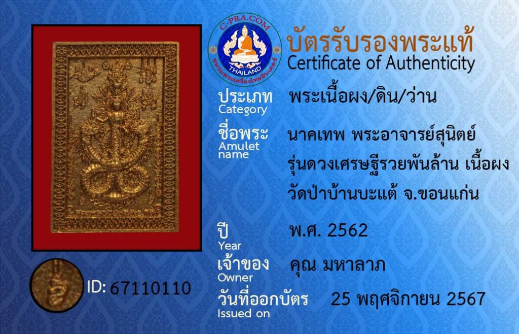 ชื่อพระ : นาคเทพ พระอาจารย์สุนิตย์ รุ่นดวงเศรษฐีรวยพันล้าน เนื้อผง วัดป่าบ้านบะแต้ จ.ขอนแก่น