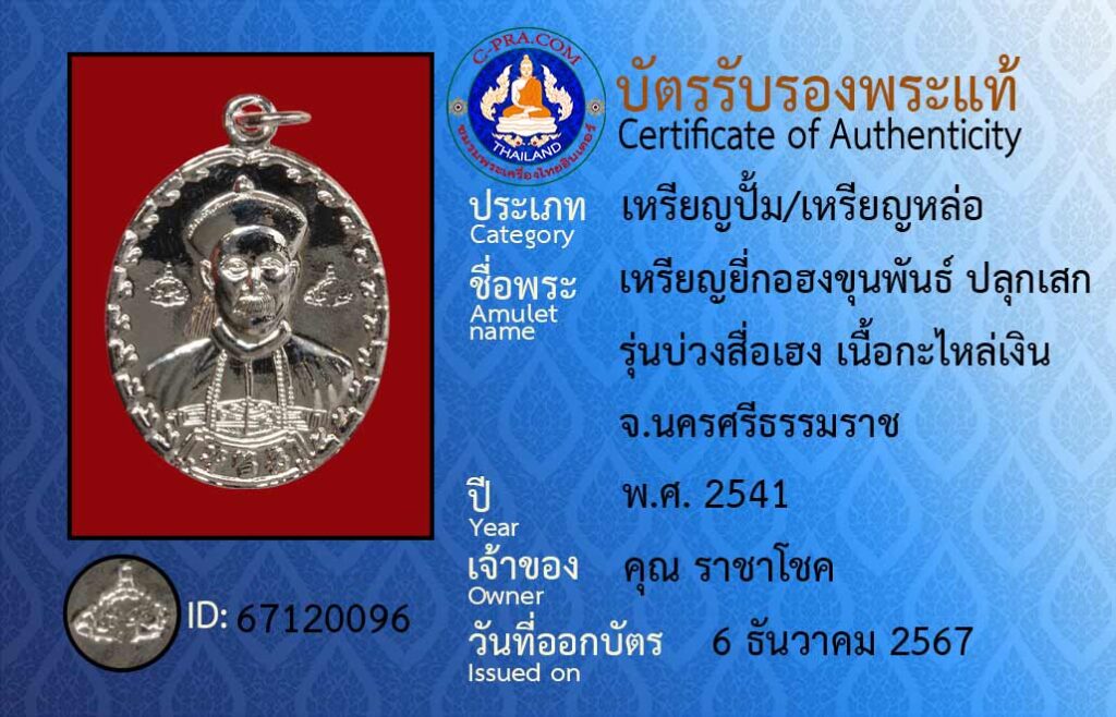 Amulet name : Riian yee gor hong kun pan · bpluk sek · run buang seu heng · neua ga lai silver. Nakhon Si Thammarat.