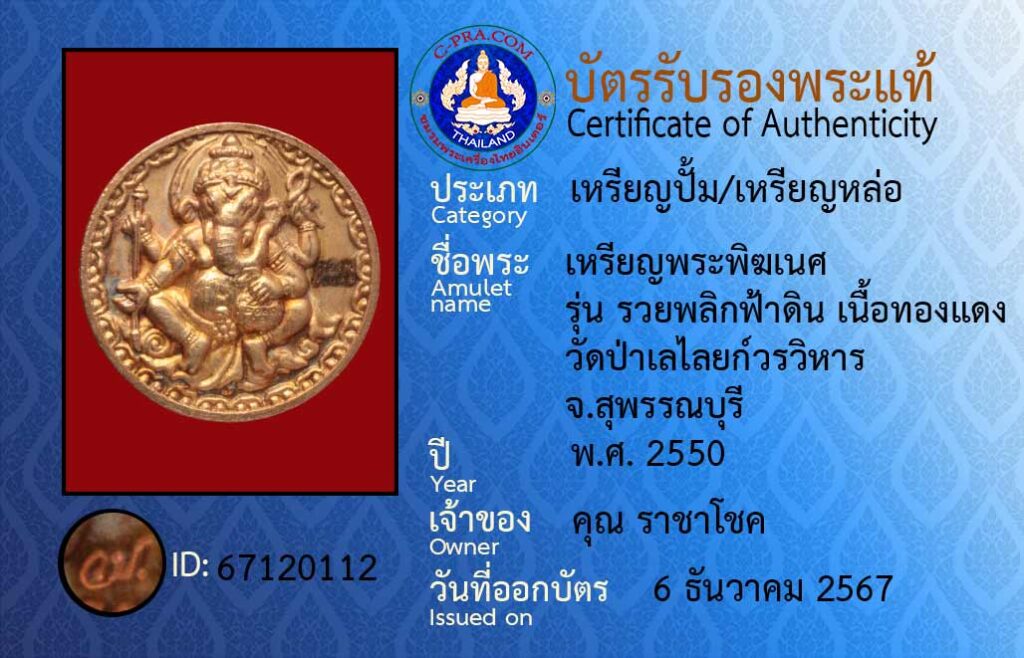 ชื่อพระ : เหรียญพระพิฆเนศ รุ่น รวยพลิกฟ้าดิน เนื้อทองแดง วัดป่าเลไลยก์วรวิหาร จ.สุพรรณบุรี