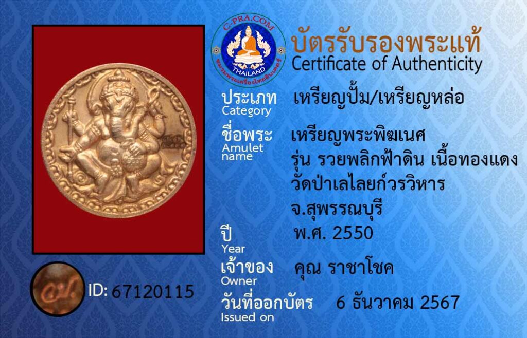 ชื่อพระ : เหรียญพระพิฆเนศ รุ่น รวยพลิกฟ้าดิน เนื้อทองแดง วัดป่าเลไลยก์วรวิหาร จ.สุพรรณบุรี