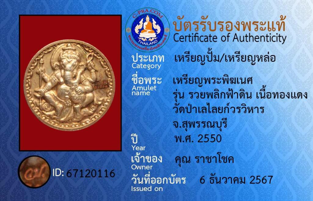 Amulet name : Ganesha coin, “Rich, Turning the Sky and Earth” model, copper material, Wat Pa Lelai Worawihan, Suphan Buri Province