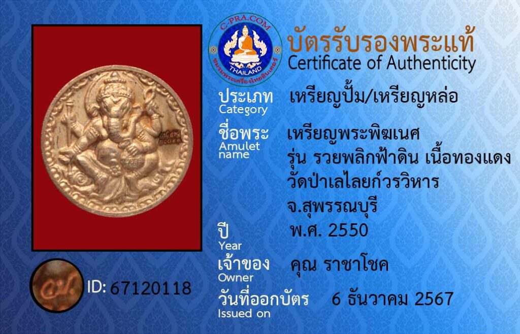 ชื่อพระ : เหรียญพระพิฆเนศ รุ่น รวยพลิกฟ้าดิน เนื้อทองแดง วัดป่าเลไลยก์วรวิหาร จ.สุพรรณบุรี