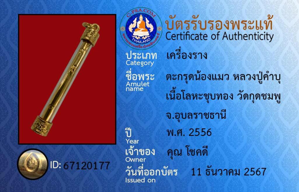 ชื่อพระ :ตะกรุดน้องแมว หลวงปู่คำบุ เนื้อโลหะชุบทอง วัดกุดชมพู จ.อุบลราชธานี
