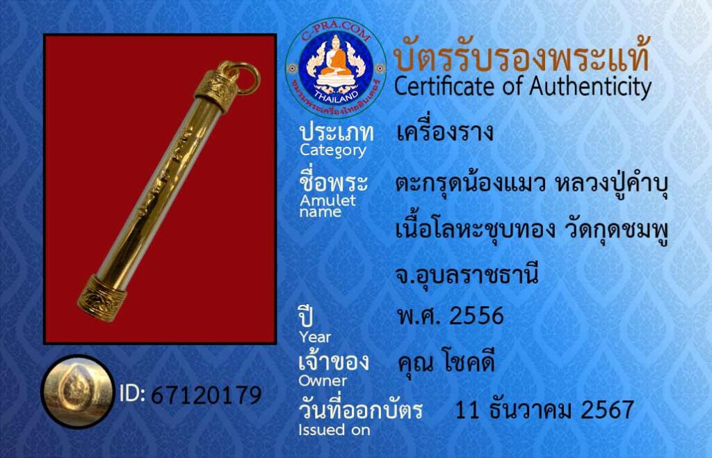 ชื่อพระ :ตะกรุดน้องแมว หลวงปู่คำบุ เนื้อโลหะชุบทอง วัดกุดชมพู จ.อุบลราชธานี