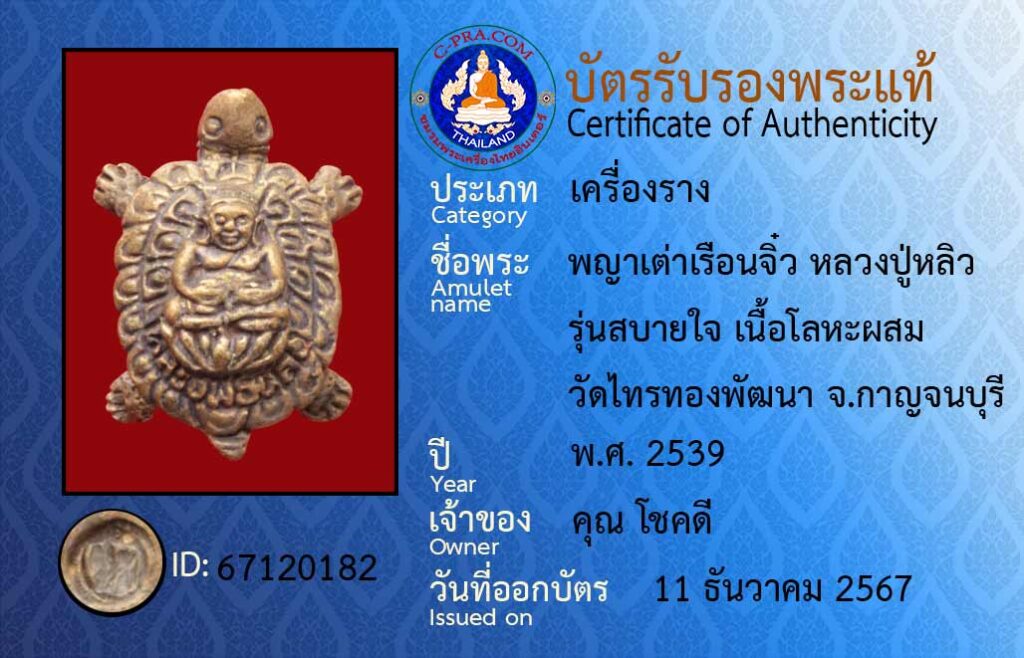 ชื่อพระ :พญาเต่าเรือนจิ๋ว หลวงปู่หลิว รุ่นสบายใจ เนื้อโลหะผสม วัดไทรทองพัฒนา จ.กาญจนบุรี