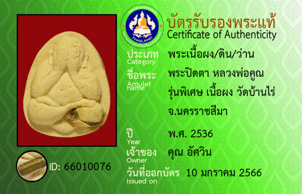 Amulet name : pra pid ta luang por koon wat ban rai