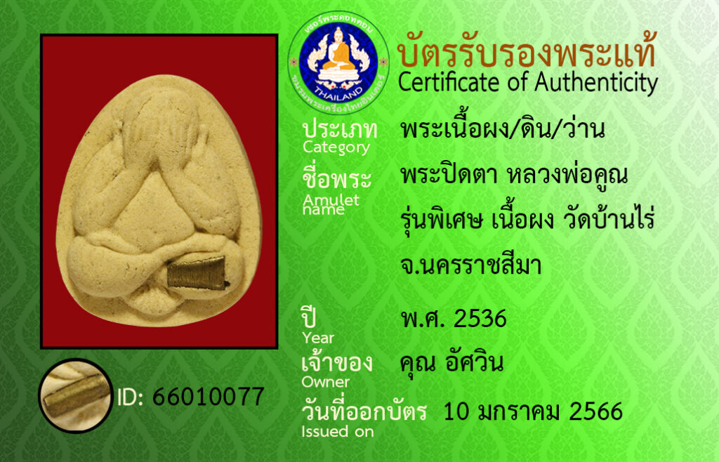 Amulet name : pra pid ta luang por koon wat ban rai