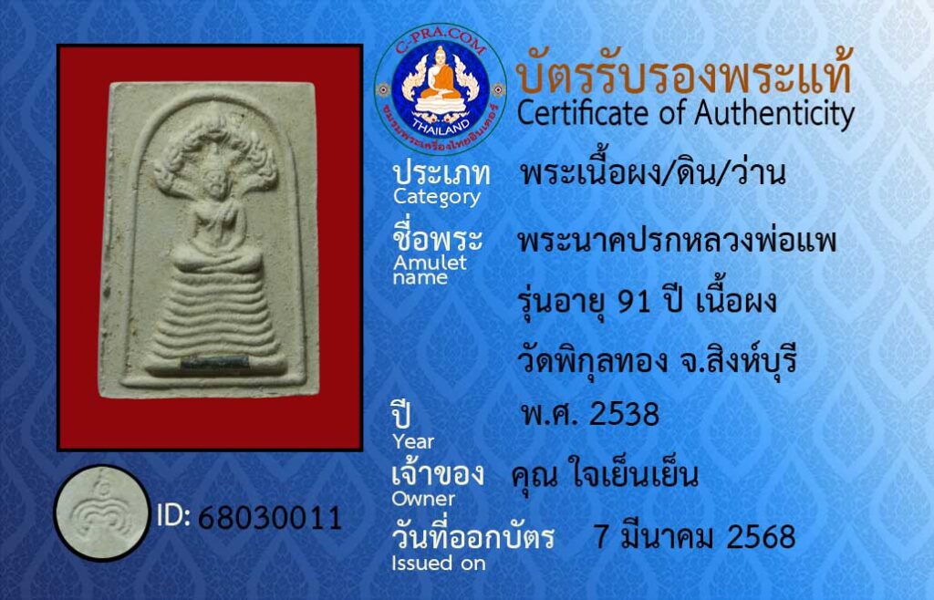ชื่อพระ : พระนาคปรกหลวงพ่อแพ รุ่นอายุ 91 ปี เนื้อผง วัดพิกุลทอง จ.สิงห์บุรี
