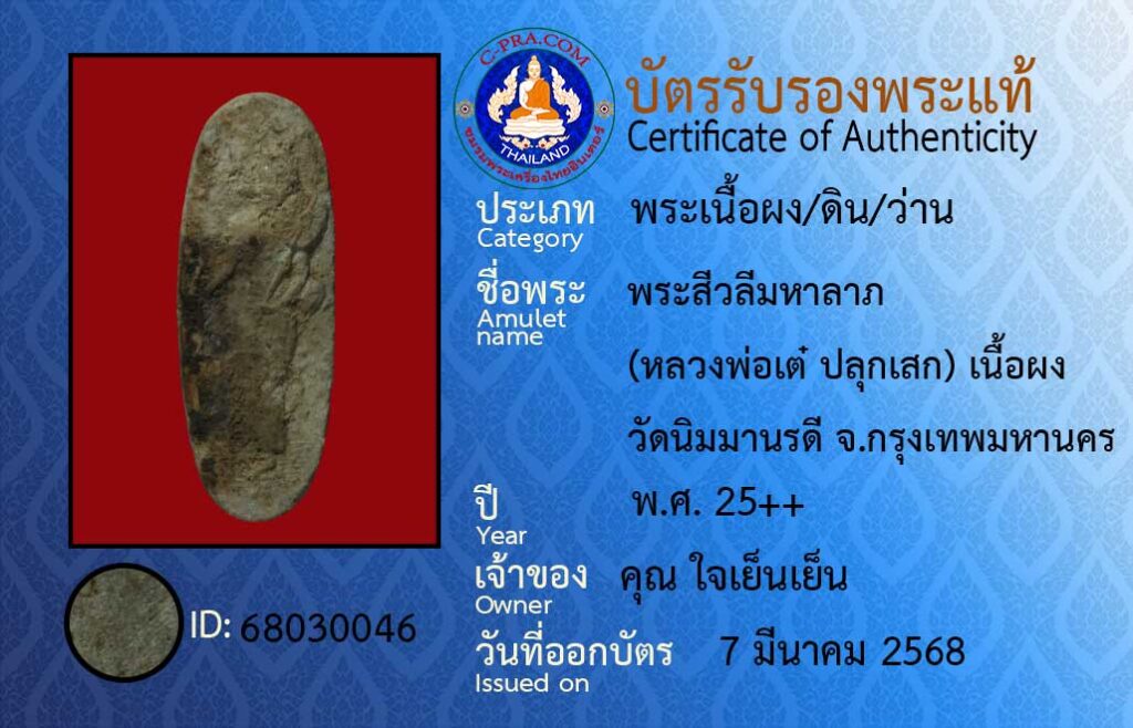 Amulet name : pra see wa-lee ma-ha-lap luang por tay pluk sek neua pong wat-nim-man-ra-dee Bangkok