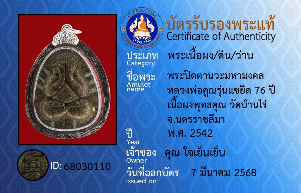 Amulet name :Phra Pidta Nawa Maha Mongkol, Luang Pho Khun, 76th birthday edition, Buddha amulet powder, Ban Rai Temple, Nakhon Ratchasima Province