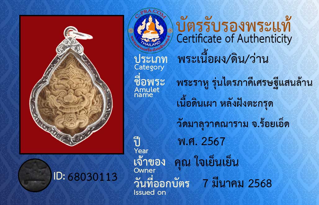 ชื่อพระ :พระราหู รุ่นไตรภาคีเศรษฐีแสนล้าน