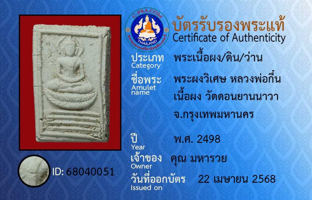 Amulet name :Magical Buddha amulet, Luang Pho Kuen, made from powder, Wat Don Yan Nawa, Bangkok