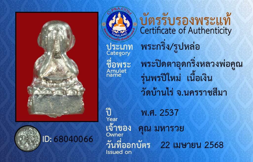 Amulet name :Phra Pidta Udomkring Luang Pho Khun, New Year’s Blessing Edition, silver, Ban Rai Temple, Nakhon Ratchasima Province