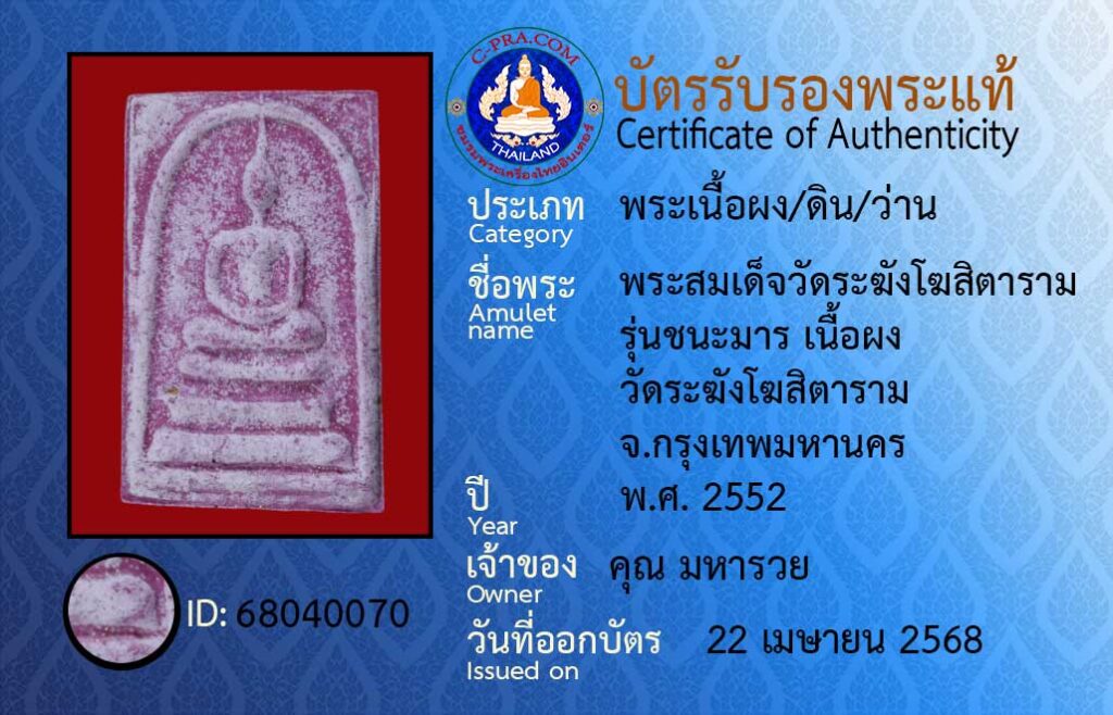 ชื่อพระ :พระสมเด็จวัดระฆังโฆสิตาราม รุ่นชนะมาร เนื้อผง วัดระฆังโฆสิตาราม จ.กรุงเทพมหานคร