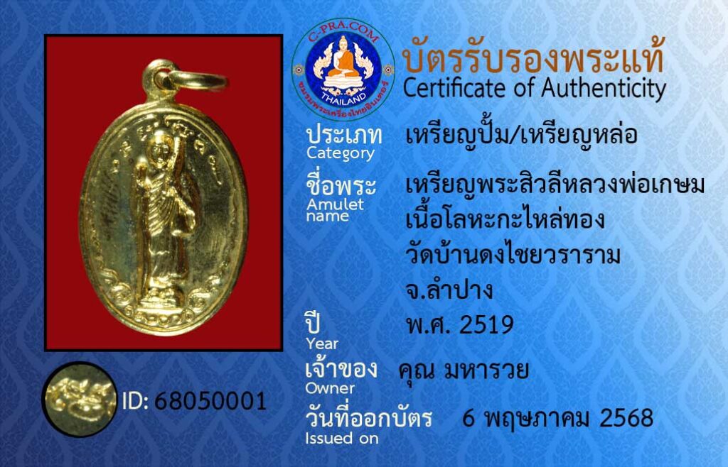ชื่อพระ : เหรียญพระสิวลีหลวงพ่อเกษม เนื้อโลหะกะไหล่ทอง วัดบ้านดงไชยวราราม จ.ลำปาง