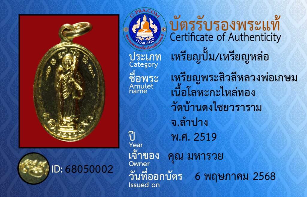 ชื่อพระ : เหรียญพระสิวลีหลวงพ่อเกษม เนื้อโลหะกะไหล่ทอง วัดบ้านดงไชยวราราม จ.ลำปาง