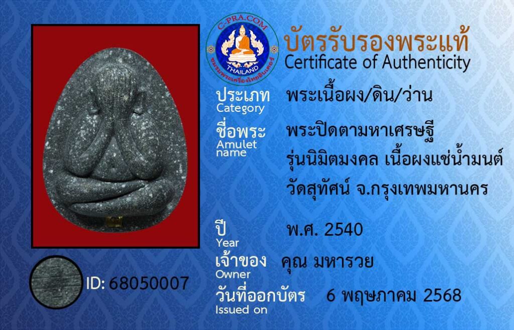Amulet name :Phra Pidta Maha Setthi, Nimit Mongkhon model, holy water-soaked powder, Suthat Temple, Bangkok