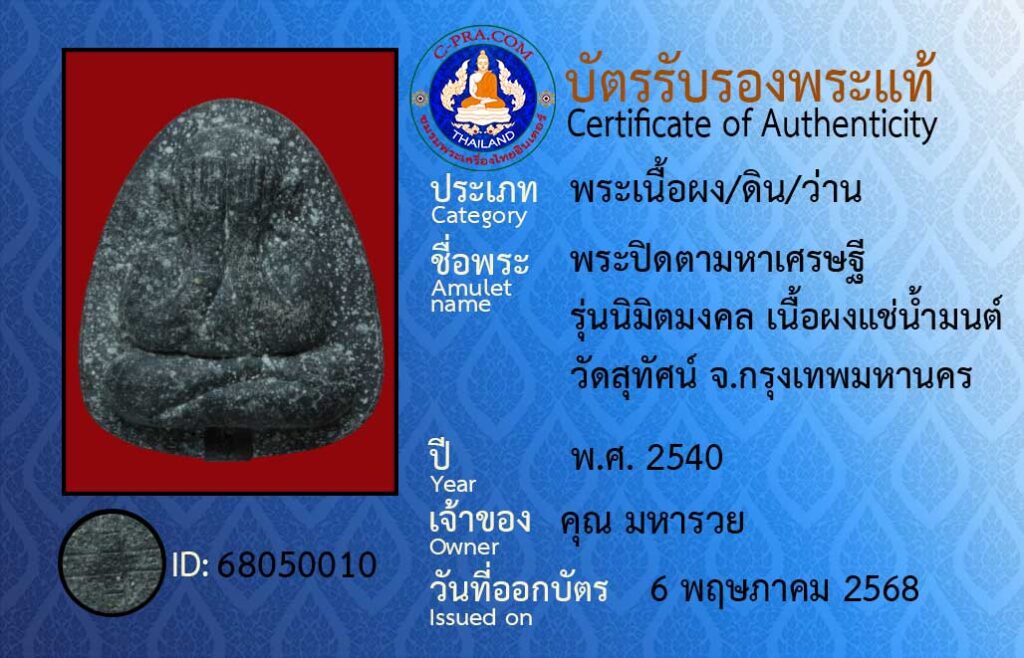 Amulet name :Phra Pidta Maha Setthi, Nimit Mongkhon model, holy water-soaked powder, Suthat Temple, Bangkok