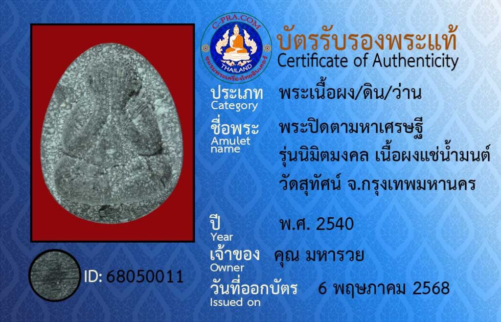 Amulet name :Phra Pidta Maha Setthi, Nimit Mongkhon model, holy water-soaked powder, Suthat Temple, Bangkok