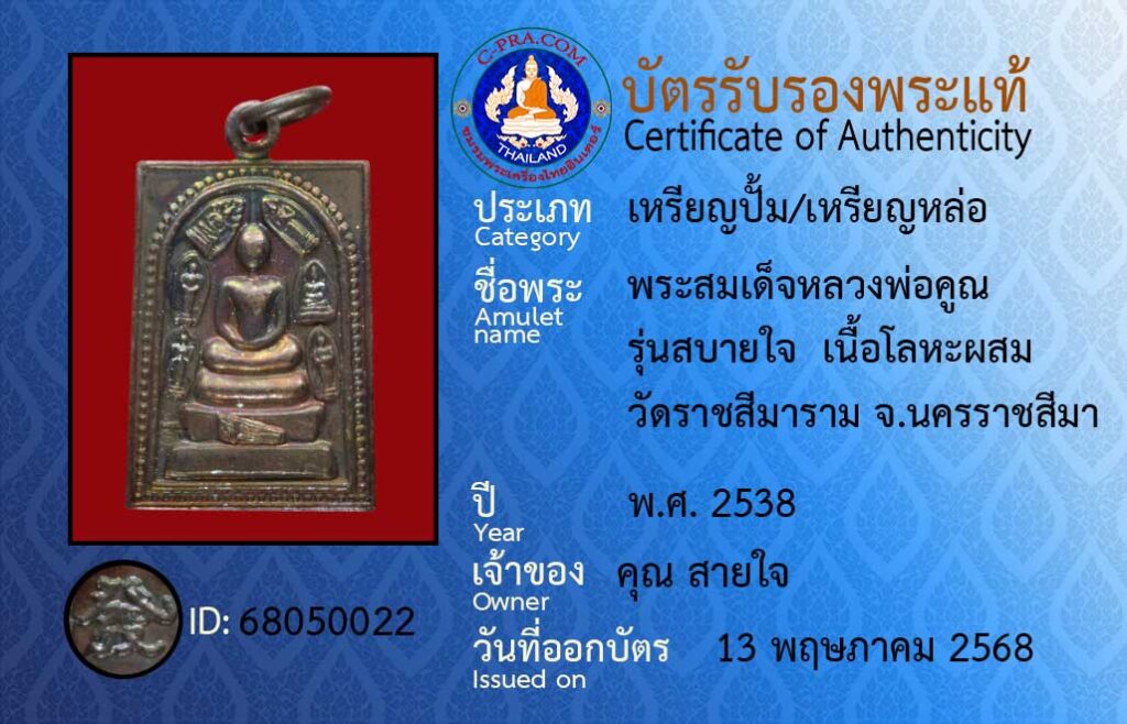 Amulet name :Phra Somdej Luang Pho Khun, Sabai Jai model, mixed metal, Wat Ratchasima Ram, Nakhon Ratchasima Province