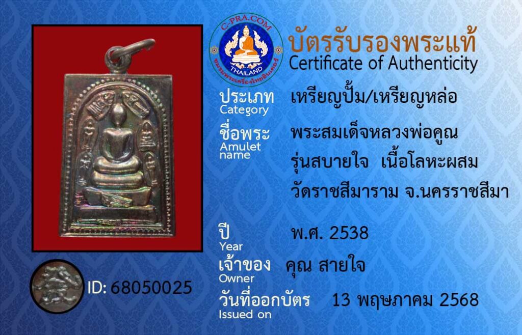 Amulet name :Phra Somdej Luang Pho Khun, Sabai Jai model, mixed metal, Wat Ratchasima Ram, Nakhon Ratchasima Province