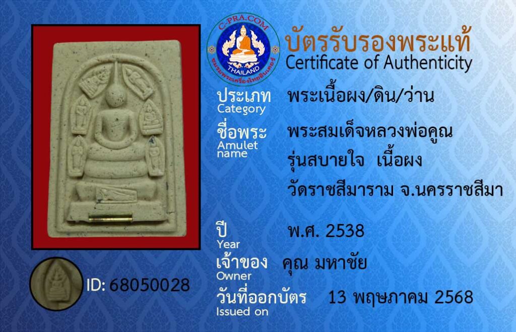 Amulet name :Phra Somdej Luang Pho Khun, Sabai Jai model, powder material, Wat Ratchasima Ram, Nakhon Ratchasima Province