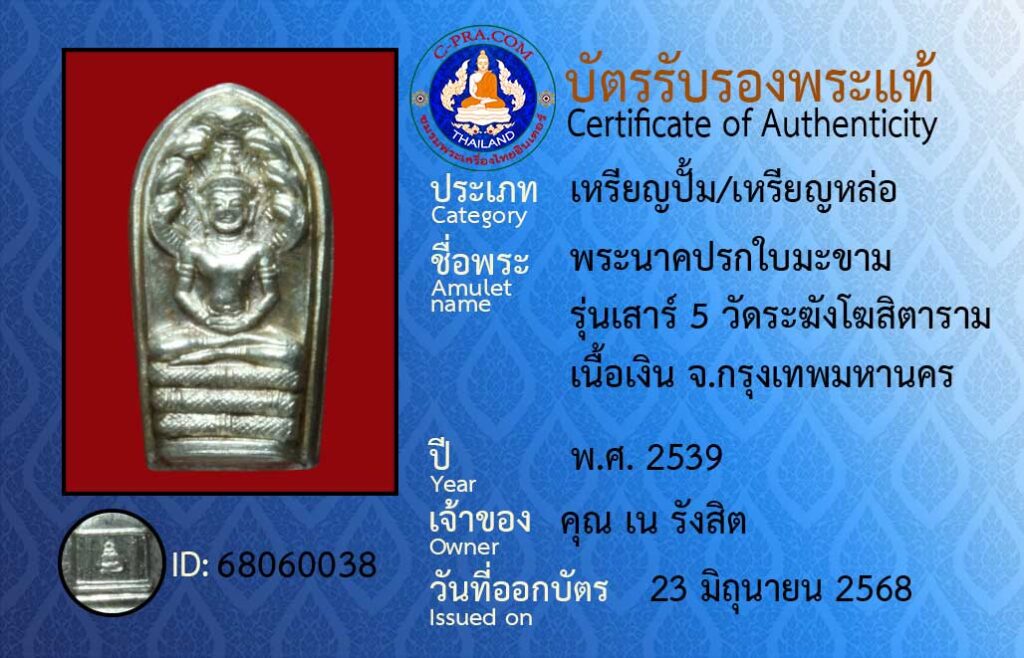 ชื่อพระ :พระนาคปรกใบมะขาม รุ่นเสาร์ 5 วัดระฆังโฆสิตารามเนื้อเงิน จ.กรุงเทพมหานคร
