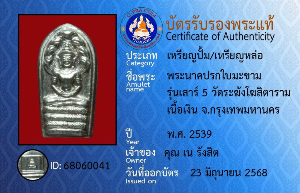 ชื่อพระ :พระนาคปรกใบมะขาม รุ่นเสาร์ 5 วัดระฆังโฆสิตารามเนื้อเงิน จ.กรุงเทพมหานคร