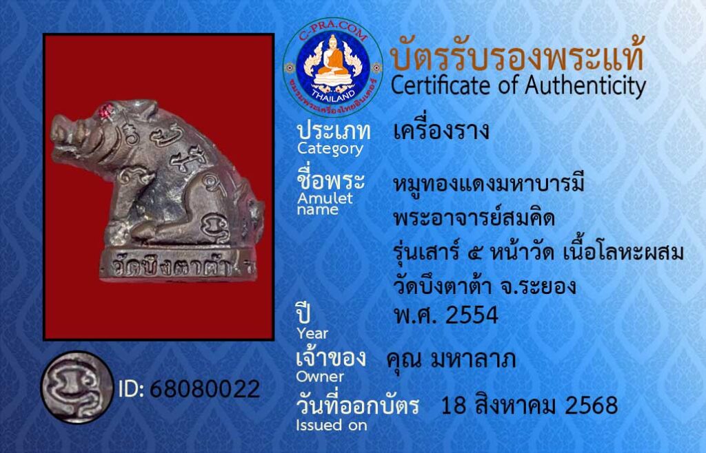 Amulet name :“Copper Pig of Great Blessings — Phra Ajarn Somkid, ‘Saturday 5th’ Front of the Temple Edition, Alloy Metal, Wat Bueng Tata, Rayong Province.