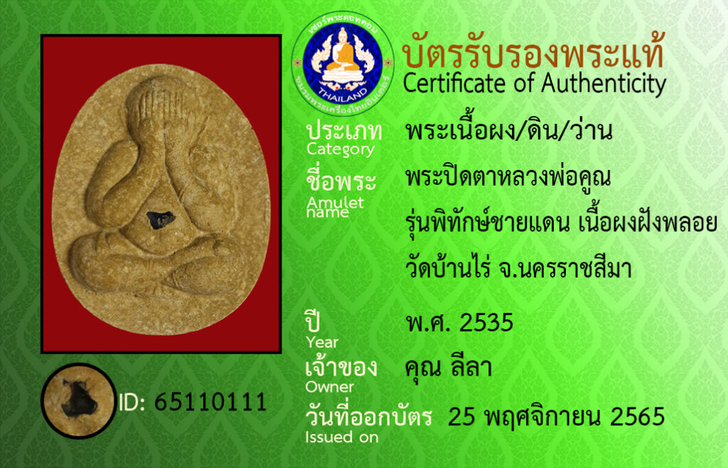 Amulet name : pra pid ta luang por koon wat ban rai