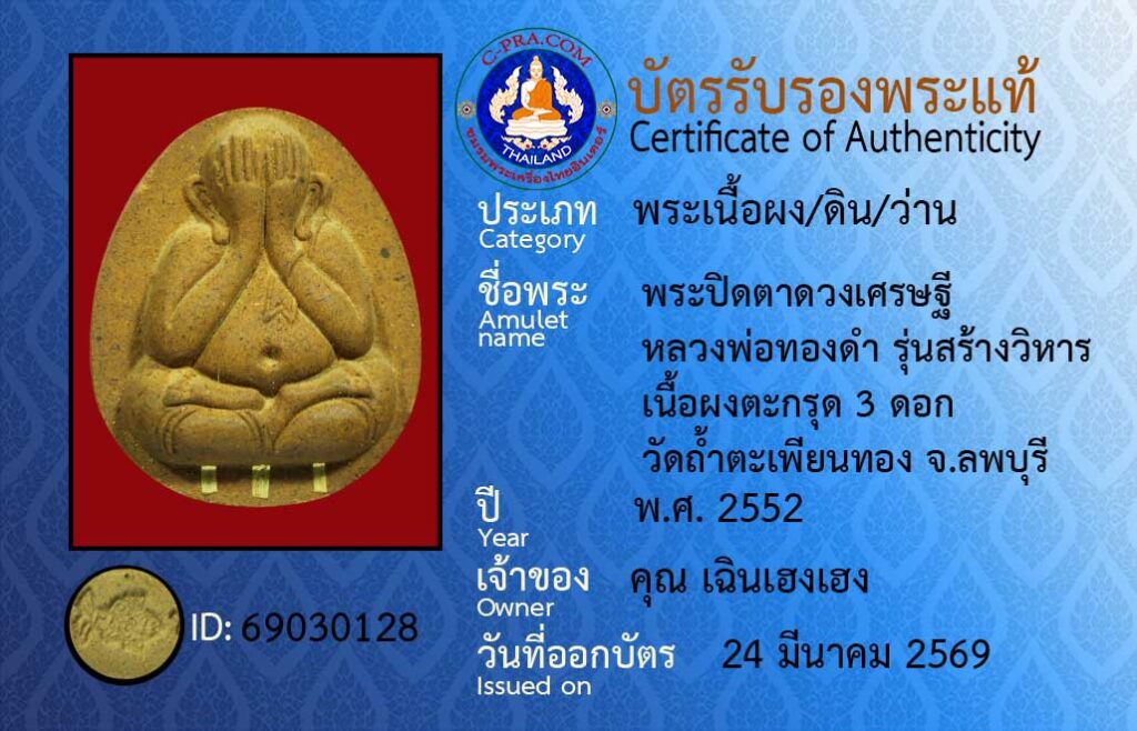 ชื่อพระ :พระปิดตาดวงเศรษฐี หลวงพ่อทองดำ รุ่นสร้างวิหาร เนื้อผงตะกรุดเงิน 9 ดอก วัดถ้ำตะเพียนทอง จ.ลพบุรี