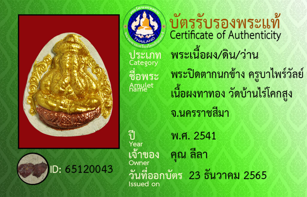 ชื่อพระ : พระปิดตากนกข้าง ครูบาไพรวัลย์ เนื้อผงทาทอง วัดบ้านไร่โคกสูง จ.นครราชสีมา