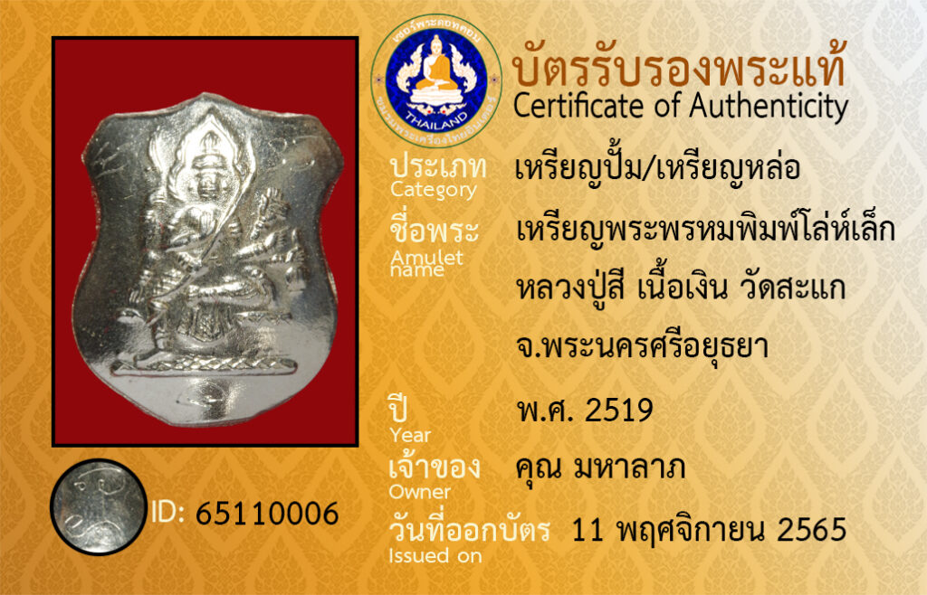 ชื่อพระ : เหรียญพระพรหมพิมพ์โล่ห์เล็ก หลวงปู่สี เนื้อเงิน วัดสะเเก จ.พระนครศรีอยุธยา