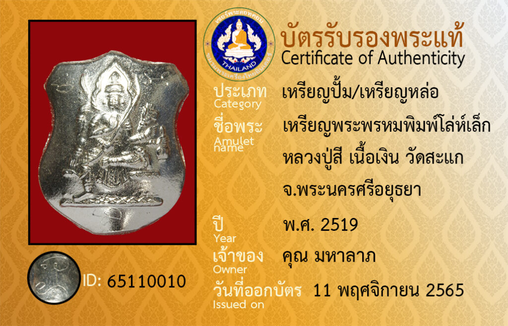 ชื่อพระ : เหรียญพระพรหมพิมพ์โล่ห์เล็ก หลวงปู่สี เนื้อเงิน วัดสะเเก จ.พระนครศรีอยุธยา