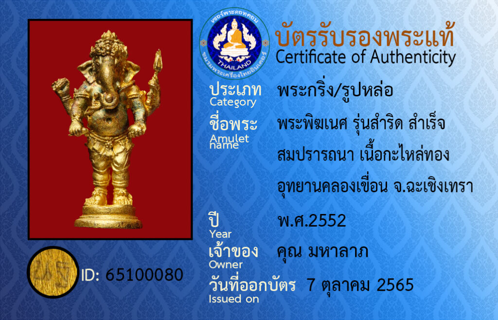 ชื่อพระ : พระพิฆเนศ รุ่นสำริด สำเร็จ สมปราถนา เนื้อกะไหล่ทอง อุทยานคลองเขื่อน จ. ฉะเชิงเทรา