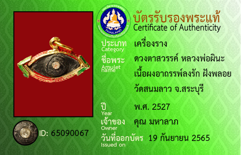 ชื่อพระ : ดวงตาสวรรค์ หลวงพ่อผินะ เนื้อผงอาถรรพ์ลงรัก ฝังพลอย วัดสนมลาว จ.สระบุรี