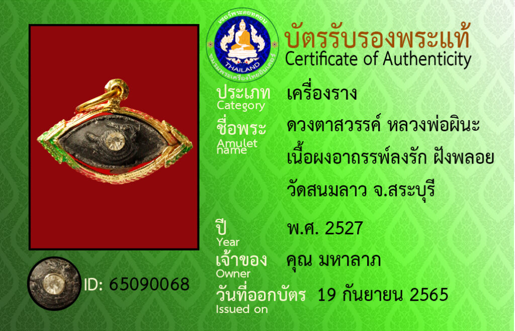 ชื่อพระ : ดวงตาสวรรค์ หลวงพ่อผินะ เนื้อผงอาถรรพ์ลงรัก ฝังพลอย วัดสนมลาว จ.สระบุรี