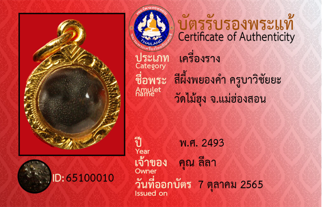 ชื่อพระ : สีผึ้งพยองคำ ครูบาวิชัยยะ วัดไม้ฮุง จ.แม่ฮองสอน