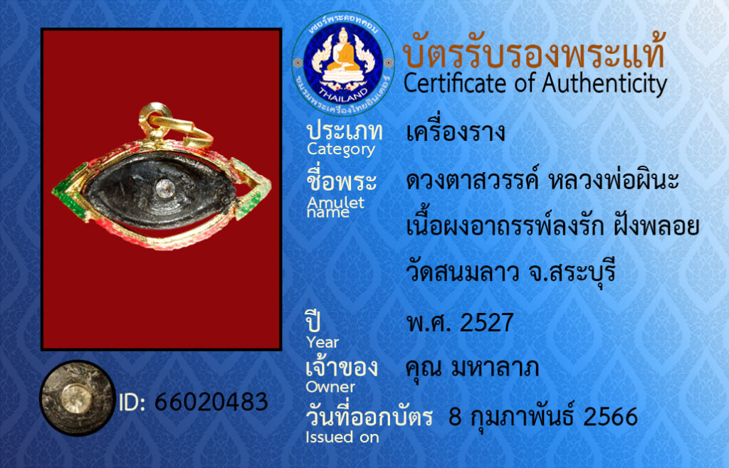 ชื่อพระ :ดวงตาสวรรค์ หลวงพ่อผินะ เนื้อผงอาถรรพ์ลงรัก ฝังพลอย วัดสนมลาว จ.สระบุรี