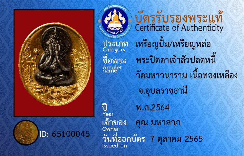 ชื่อพระ : พระปิดตาเจ้าสัวปลดหนี้ วัดมหาวนาราม เนื้อทองเหลือง จ.อุบลราชธานี