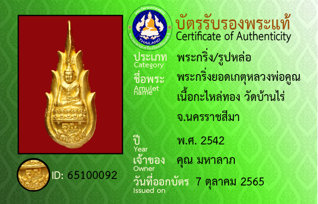 Amulet name : pra gring yot get luang por koon neua ga lai tong wat ban rai